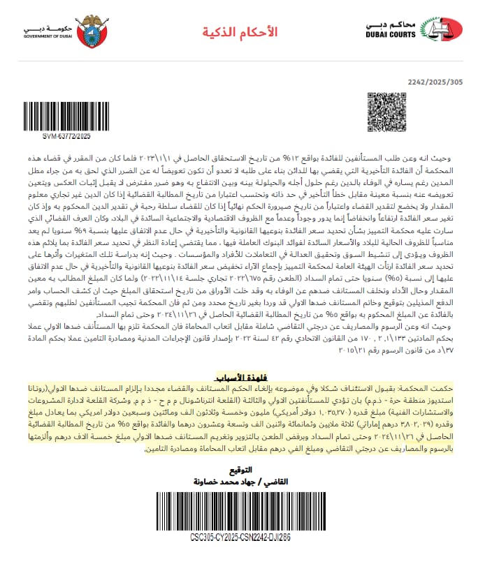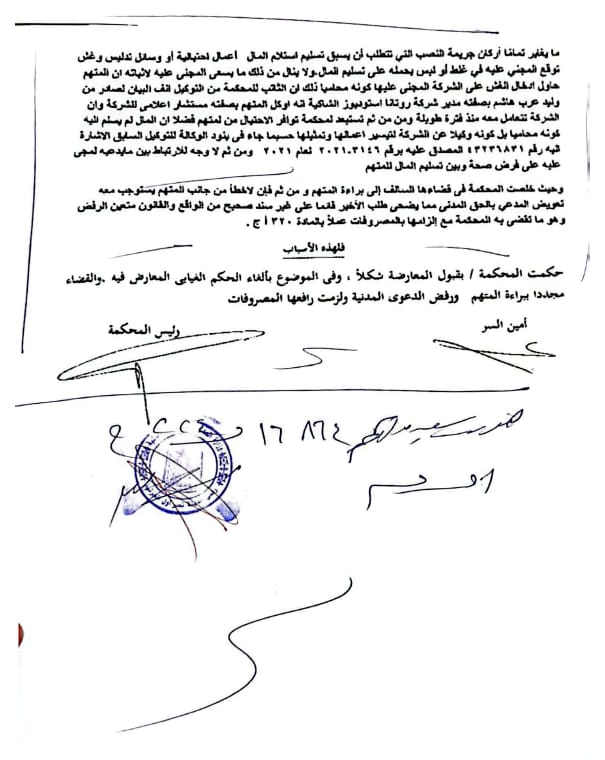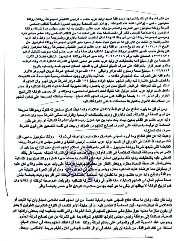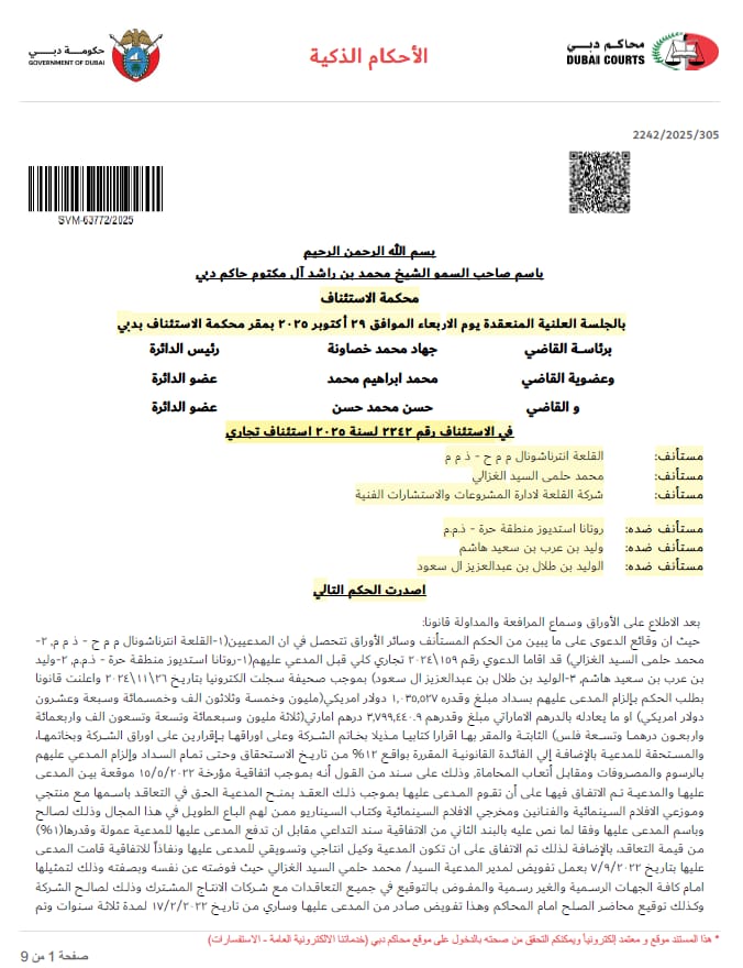 حكمت محكمة مدينة نصر الجزئية بجمهورية مصر العربية برئاسة القاضي مصطفى فاضل في سبتمبر الماضي بقبول المعارضة المقدمة من رجل الاعمال المصري محمد حلمي الغزالي مالك شركة القلعة انترناشيونال للاستشارات الفنية بالإمارات ومستشار شركة روتانا في مصر سابقا ، وإلغاء الحكم الغيابي الصادر ضده، وبراءته من كل التهم الموجهة له ورفض الدعوى المدنية لشركة روتانا مصر، ونتيجة لذلك الحكم أصدرت محكمة استئناف دبي بدولة الامارات العربية المتحدة برئاسة القاضي جهاد خصاونة في 29 أكتوبر 2025 بقبول الاستئناف شكلا وموضوعا وإلزام المستأنف ضدهم شركة روتانا إستوديوز والتي يمثلها: السعودي صاحب السمو الملكي الأمير الوليد بن طلال مالك مجموعة شركات روتانا القابضة بالوطن العربي، والسعودي الدكتور وليد هاشم نائب رئيس مجلس ادارة مجموعة شركات روتانا القابضة والرئيس التنفيذي السابق لشركة روتانا دبي ذ م م. في المنطقة الحرة بالإمارات، بدفع مبلغ مليون وخمسة وثلاثون ألف وخمسمائة وسبعة وعشرون دولار امريكي، لصالح رجل الاعمال المصري محمد حلمي الغزالي وذلك تعويضا له عن مستحقات متأخرة له وعن القضايا الملفقة له في مصر والامارات بالسرقة والاختلاس والتزوير، وكذلك مبلغ خمسة الاف درهم امارتي نظير رفض الطعن بالتزوير وألفي درهم لرسوم التقاضي واتعاب المحاماة.