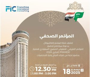 يقيم جهاز تنمية المشروعات المصري بالتعاون مع شركة فرنشايز انترناشونال مؤتمرا تعريفيا للمعرض «المصري السعودي الدولي للامتياز التجاري» يوم الخميس المقبل الموافق 18 ديسمبر 2025 الساعة الواحدة ظهرا بأحد فنادق القاهرة.