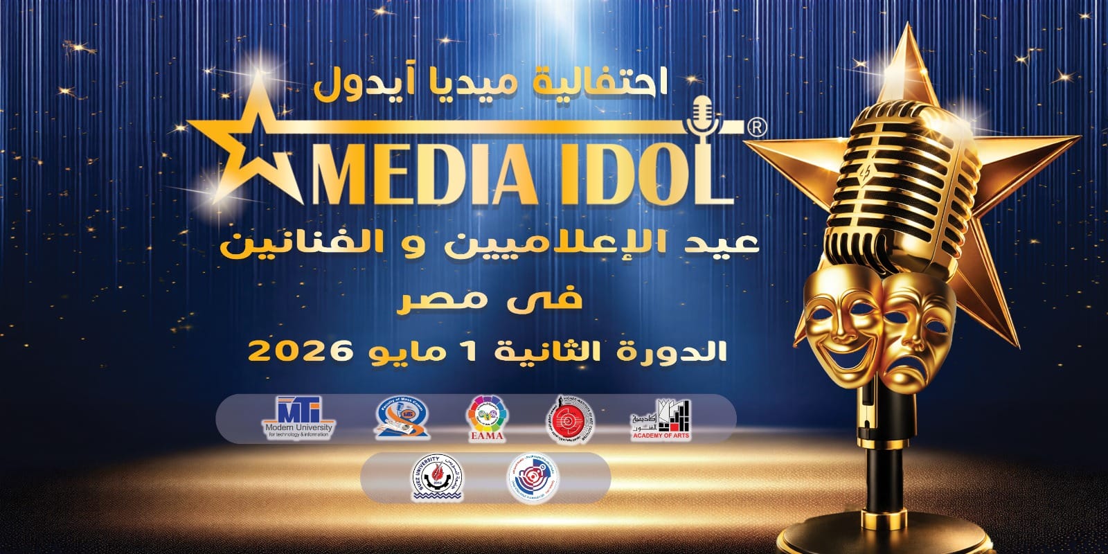 في إطار التحضير للدورة الثانية من احتفالية «ميديا آيدول» والتي تنظمها وكالة eama الاعلامية تحت شعار «عيد الإعلاميين والفنانين في مصر» والمقرر إقامتها على مسرح الدكتورة نهاد صليحة بإذن الله يوم 1 مايو 2026، توجه الإعلامي محمد بدر الرئيس التنفيذي للاحتفالية بالشكر لأكاديمية الفنون ممثلة في «المعهد العالي للنقد الفني» بقيادة الدكتور وليد شوشة عميد المعهد، والجامعة الحديثة للتكنولوجيا والمعلومات ام تي اي ممثلة في «كلية الإعلام» بقيادة الدكتور سامي الشريف عميد الكلية، على استمرار رعايتهما للاحتفالية.
