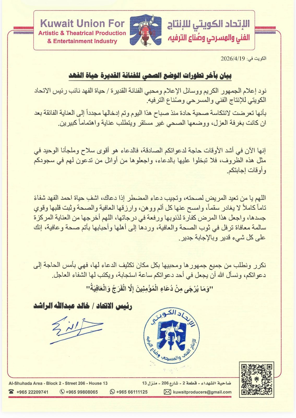 وأوضح بيان صادر عن نائب رئيس الاتحاد الكويتي للإنتاج الفني والمسرحي وصنّاع الترفيه أن وضعها الصحي غير مستقر حاليًا، ويتطلب متابعة طبية دقيقة وعناية مكثفة، وسط اهتمام كبير من الطاقم الطبي.